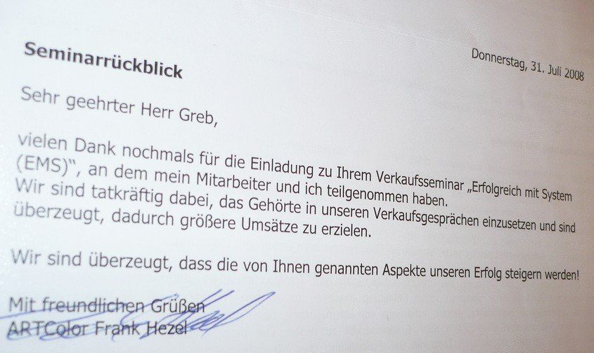 Neben der Seminar-Tätigkeit unterhält Reinhold Greb seine im Jahr 1994 gegründete Vertriebs-Firma
